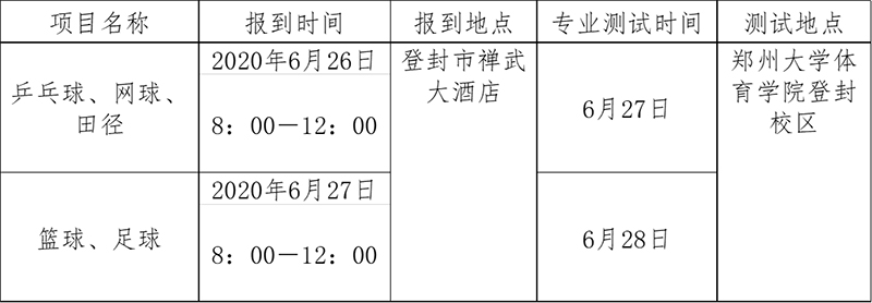 为做好新冠肺炎疫情防控下的高水平运动队专业测试工作,避免大规模流动和聚集引发交叉感染,确保师生身体健康和生命安全,保证考试安全和公平公正,根据上级部门相关文件精神,我校高水平运动队专业测试工作定于6月27日-28日在郑州大学体育学院登封校区(河南省登封市)进行,具体安排如下: