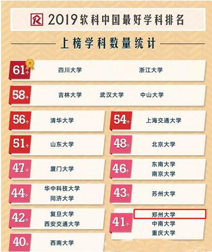 在教育部第四轮学科评估中,郑州大学有7个学科被评为B+;在《2019中国最好学科排名》中,学校共有41个学科上榜,学科上榜数位居全国第18位;在2020年QS世界大学学科排名中,郑州大学有4个学科上榜,上榜学科数全国排名37位;在2020年USNews大学排名中,学校有8个学科入选,名列全球794位……